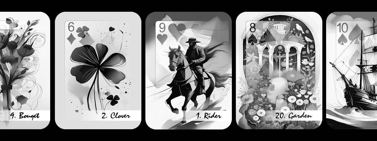 With the 'Obsidian Reflections' Lenormand Deck, I wanted a monochromatic, graphic novel-style approach to bring a modern look to the ancient practice. I also wanted to incorporate the corresponding playing cards as part of the image itself, instead of traditionally having the playing card as an 'Image within the image' or, as more modern decks do, just having the suit pip. However, I did not want to make this a transformation deck (although I might do one later). So, I decided that overlaying the upper left part of the card with a gradual fade into the artwork might look nice.