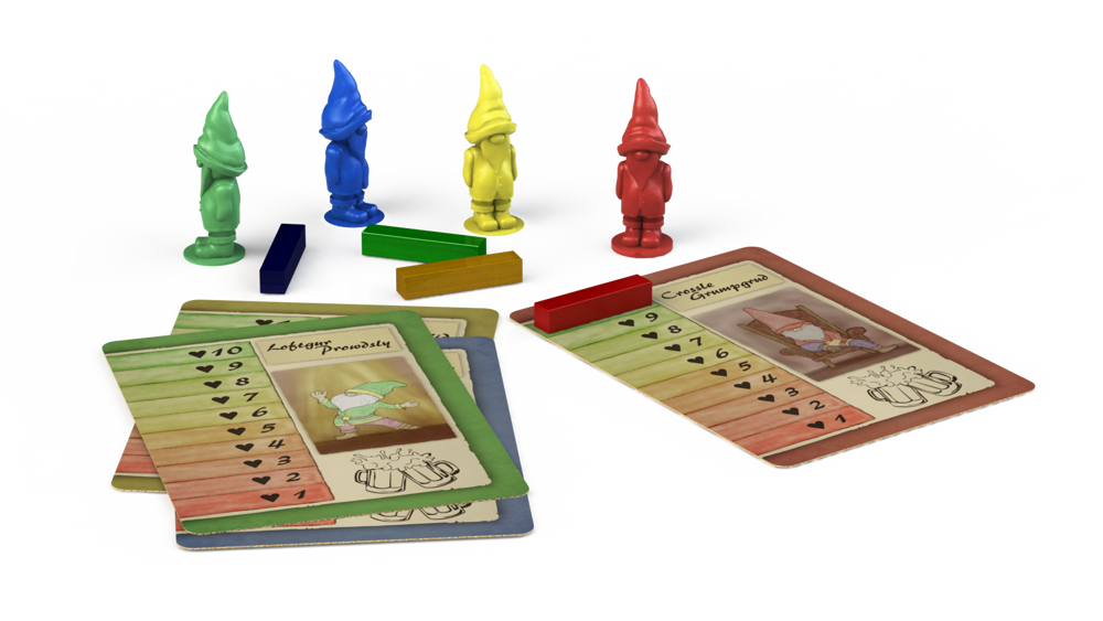 It's easy! First you select one of the four gnome character cards (along with the matching gnome and indicator bar). Your character card has a health bar along one side. Place the indicator bar at the top of your health bar and the gnome on your starting square.