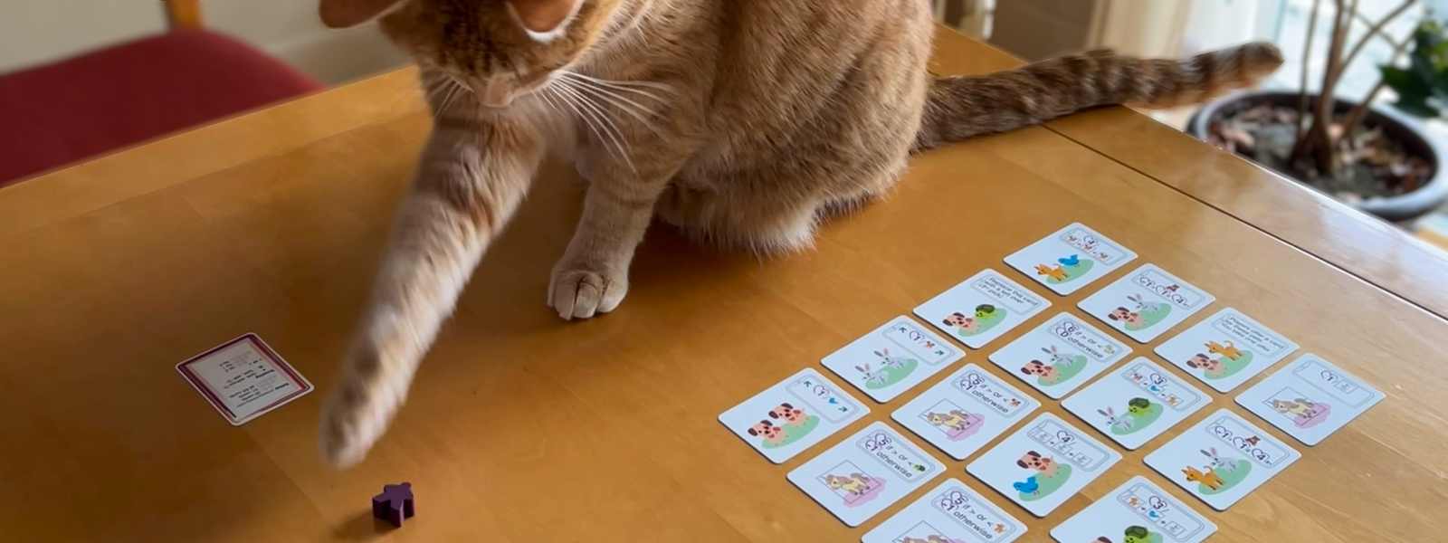 Every turn, the lead player (initially, the starting player) selects either a full row or a full column of cards from the central grid. The lead player takes one of the cards and places it in their individual tableau, oriented either vertically (for the point-scoring opportunity) or horizontally (for the pets). The remaining cards are taken by each player, one at a time in clockwise order, and placed in their individual tableaus, oriented either vertically or horizontally. The last card is taken by the lead player, who MUST place it horizontally in their individual tableau. Once a card is placed in a player’s individual tableau, it cannot be rotated to a new orientation. The central grid is then fully replenished with new cards from the deck. The lead player in the following turn is the one to the left of the current lead player.
