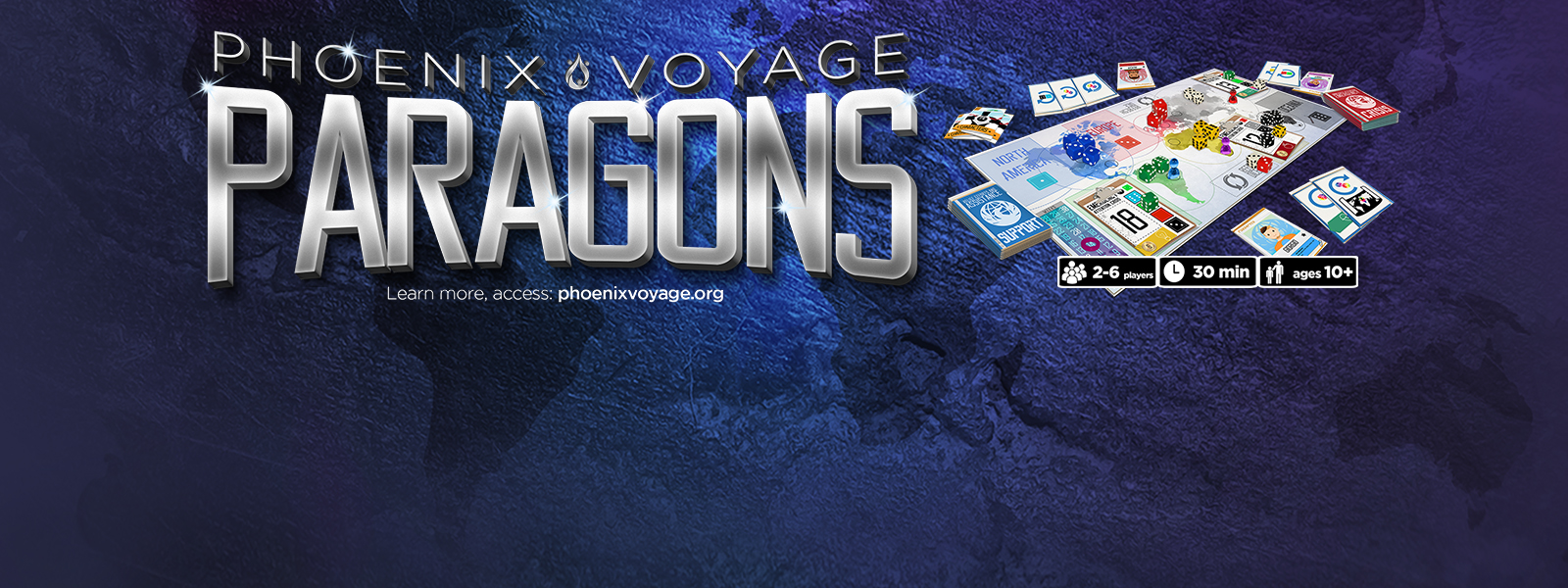 Phoenix Voyage: Paragons is a cooperative dice rolling game for 2 to 6 players. In Paragons you and your team are trying to solve as many Crises as possible by moving resources around in the form of dice. You’ll be rolling and distributing those dice to the other players, which are responsible for allocating as they see fit on the Crisis on their region. When the Weeks Timer runs out, the game ends.