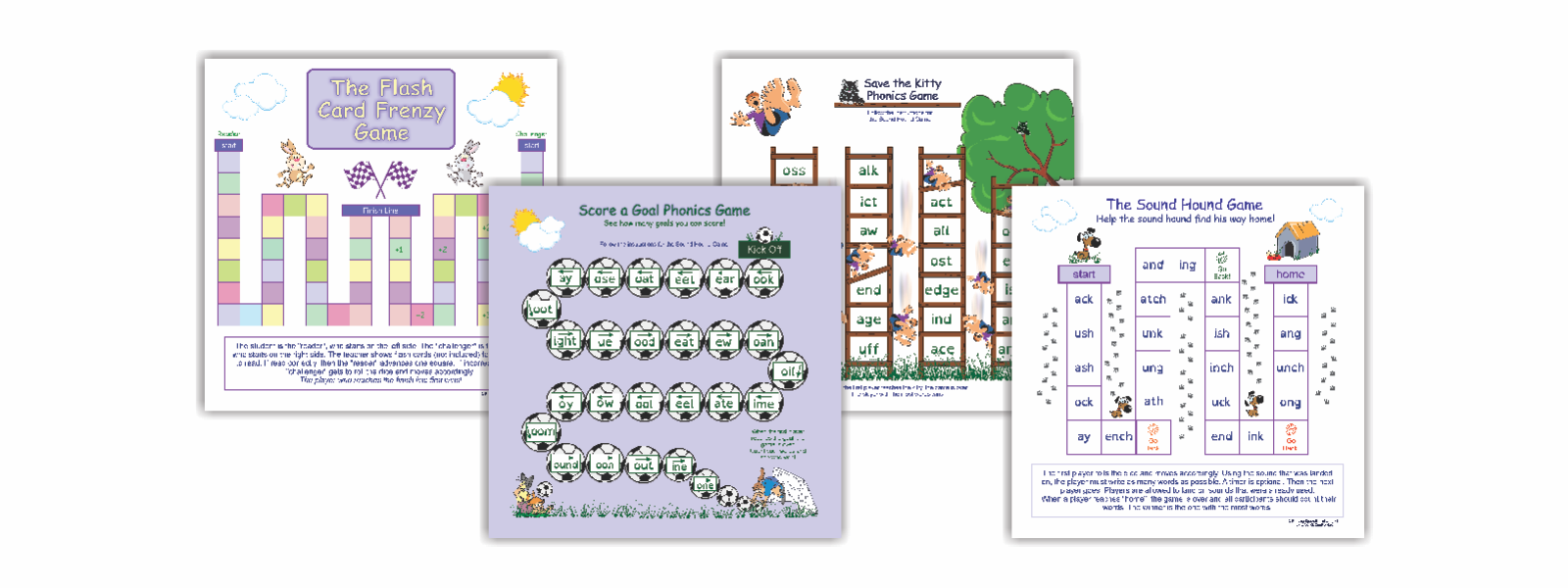These games include: 1) Flash Card Frenzy 2) The Sound Hound Game 3) Score a Goal Phonics Game 4) Save the Kitty Phonics Game