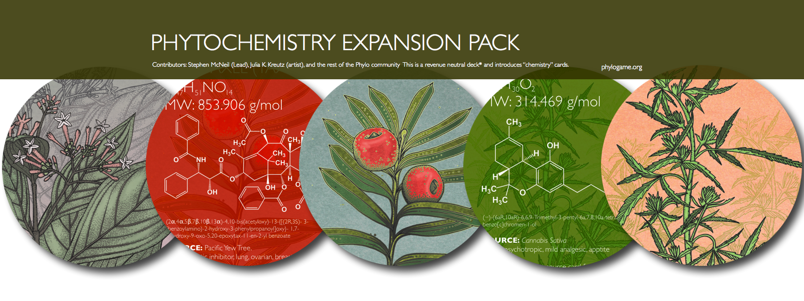 This set was designed by Dr. Stephen McNeil (and illustrated by Julia K. Kreutz) to highlight plant species that are important because of the chemical compounds they provide. As such, it introduces to the Phylo system, a new card type (Chemistry cards), as well as a new rule for expanded play in the Phylo Ecosystem Rules. This deck can be used an expansion deck for the main Phylo ecosystem game (cannot be played on its own in this manner), or used as a stand alone game where pair wise mechanics are followed (i.e. memory, go fish, etc). Includes duplicates of 10 different plant species cards, and 10 associated phytochemical cards.