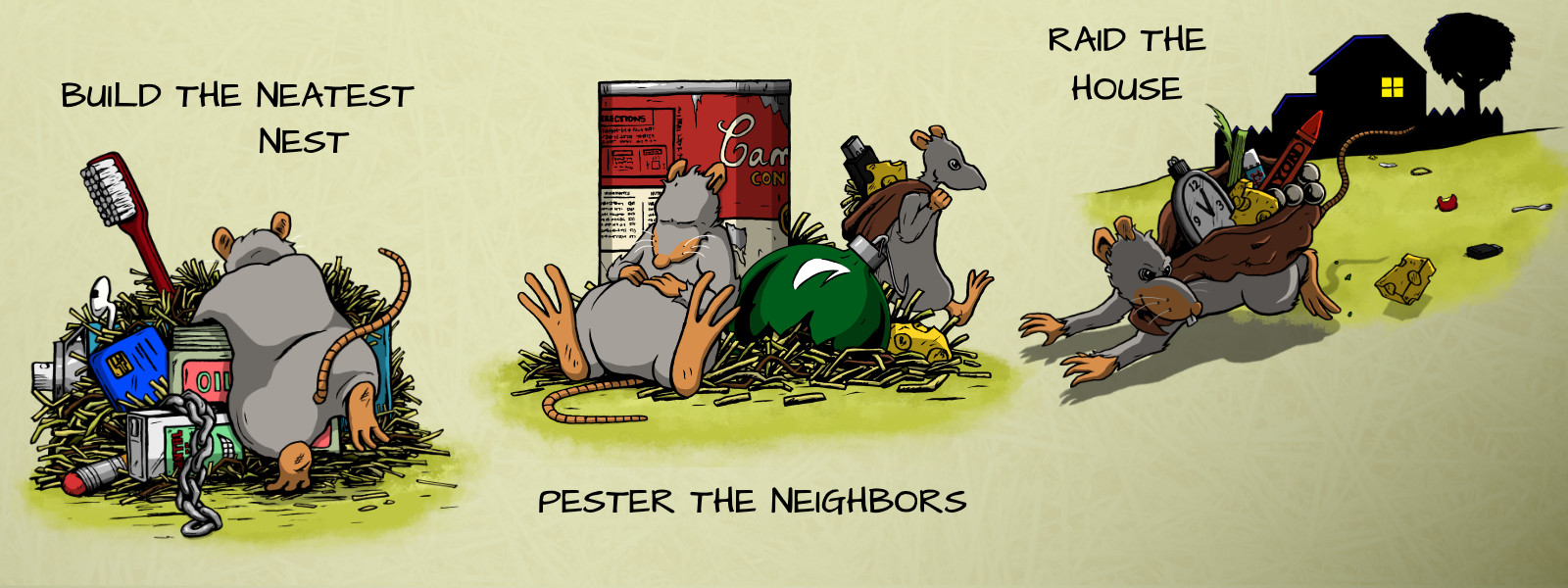 In Picky Packrats, you are a packrat neatly arranging the treasures you have collected in your midden (nest). Add treasures by raiding the house or other packrat middens. You are very particular and want everything 'just so.'