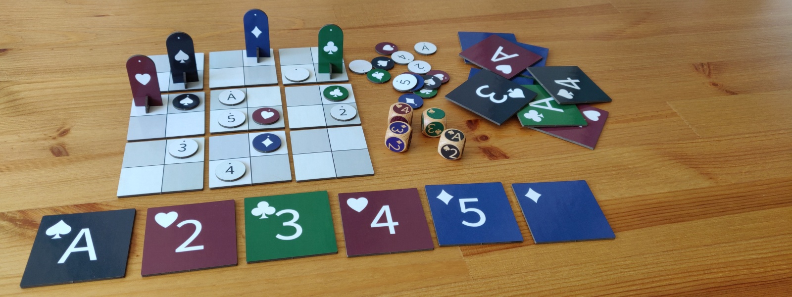 A piecepack consists of 24 tiles, 24 coins, 4 dice and 4 pawns. The pieces have 4 suits and 6 ranks. The ranks are null, ace, 2, 3, 4 and 5. The suits are usually red suns, black moons, green crowns and blue arms. But this piecepack uses red hearts, black, spades, green clubs and blue diamonds instead.