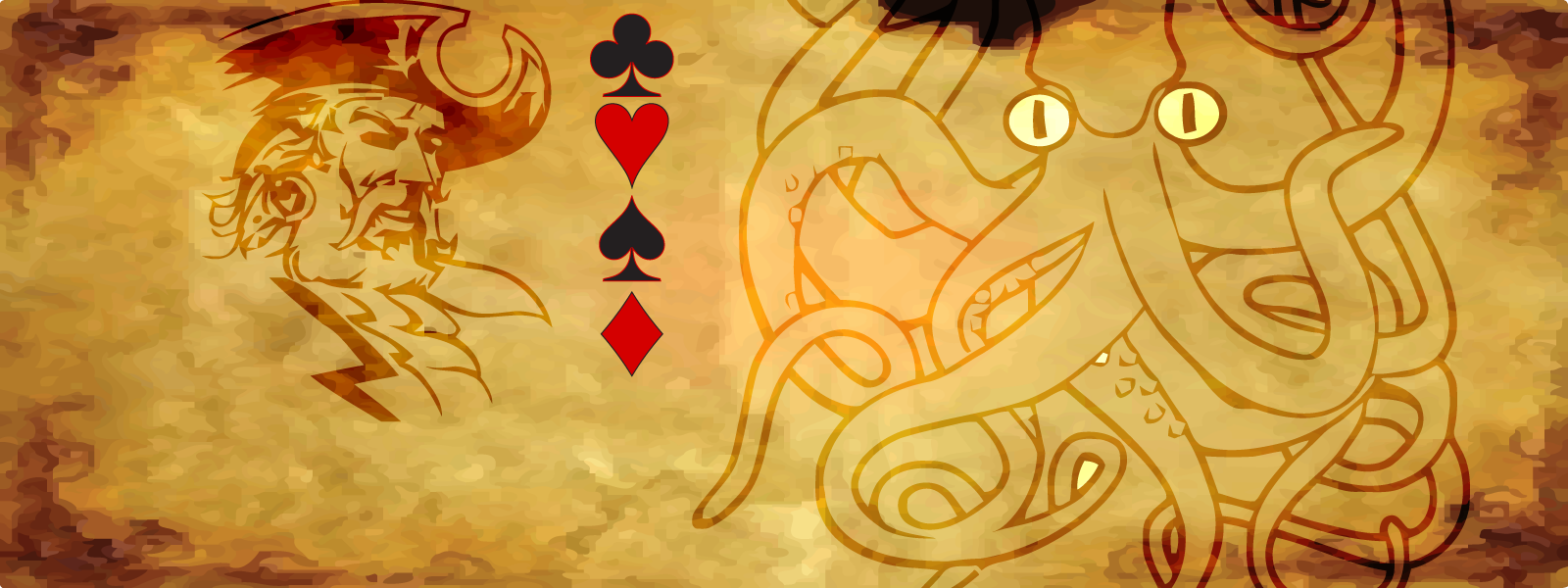 This is a standard deck of Pinochle cards, featuring a piratical feel, and scoring cards for Euchre. We consulted a Professional Magician and Card Mechanic for design tips.