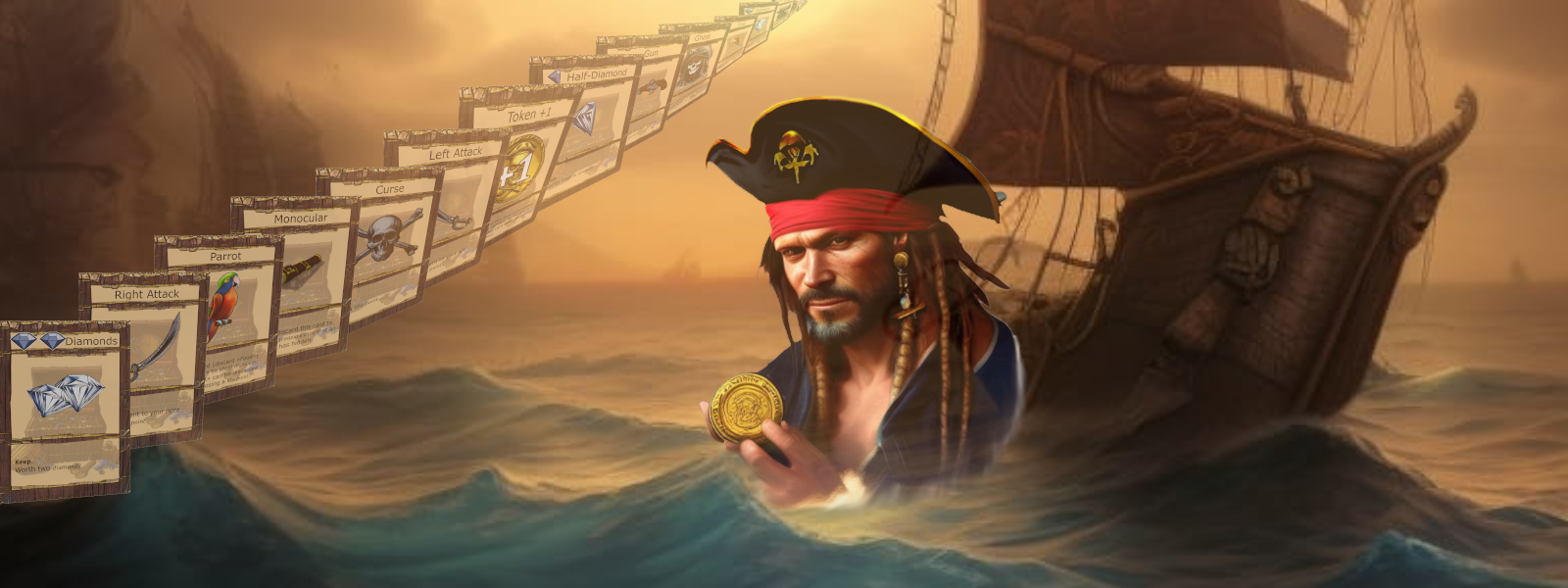 In Pirate Poker, you are a pirate in search of treasures and the goal of your quest is to be the first to find five diamonds or to eliminate your opponents.