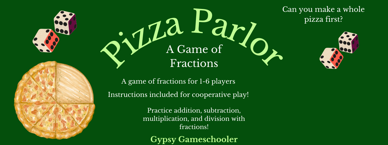 Pizza Parlor is a game of fractions for 1-6 players. Addition, subtraction, multiplication, and division! Fractions include 1/3, 1/4, 1/6, 1/8, 1/12, and 1/16.
