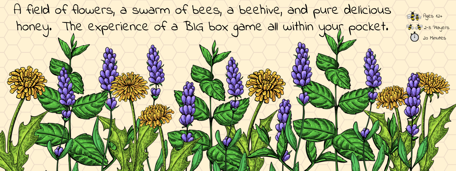 You are a beekeeper trying to harvest pure honey from a beautiful garden of dandelion, lavender, and mint. The player with the most pure honey and diverse garden will earn enough points to win the game.