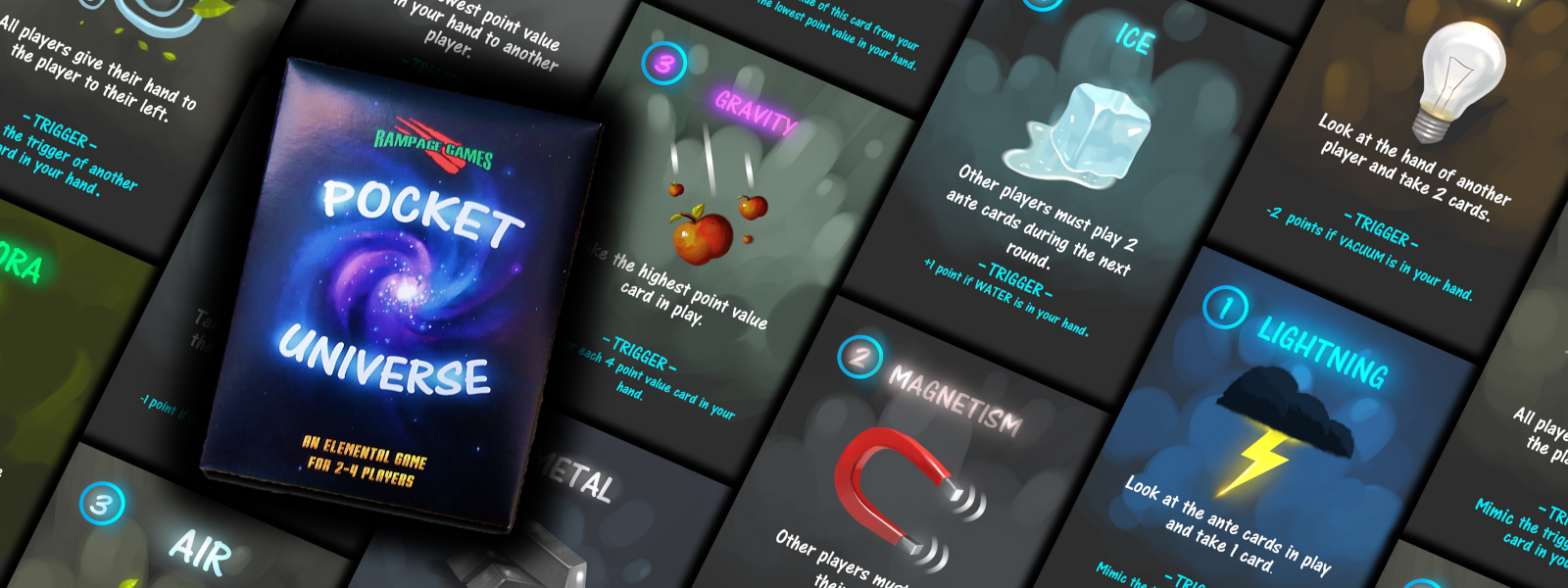 Pocket Universe is a highly strategic, take that!, elemental card game that fits in your pocket, sets up in seconds and plays in minutes! Use a collection of 18 different elements over 3 competitive rounds to sabotage your opponents and bring you closer to scoring the most points and winning the game!