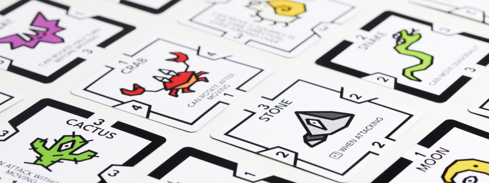 All the 24 cards are different from each other, and have very special rules that really bend the way each one is played. The simple concepts are designed to help understand and remember easily the cards' powers: fire spreads, turtle resists, hand grabs, shadow copies and so on.
