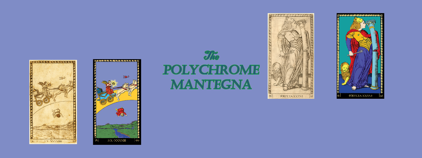 This is a digitally colored facsimile of the "Mantegna Tarot", a set of fifty engravings thought to originate in Ferrara Italy c. 1465. The Mantegna Tarot is not at all a tarot, and may not have been engraved by the Italian painter and engraver Andrea Mantegna. It is nevertheless of interest to students and users of the tarot because its creation was close in time and space to the earliest tarot decks and it therefore shares the same symbolism and world-view. Both consist of a series of images which in their entirety attempted to present an allegorical representation of the world of 15th-century Italy. As tarot creator and historian Brian Williams put it, “the Mantegna series shares with the Tarot a Renaissance impulse to chart ascending hierarchies, to create parades of allegorical characters, to categorize and compartmentalize a universe of symbols.”