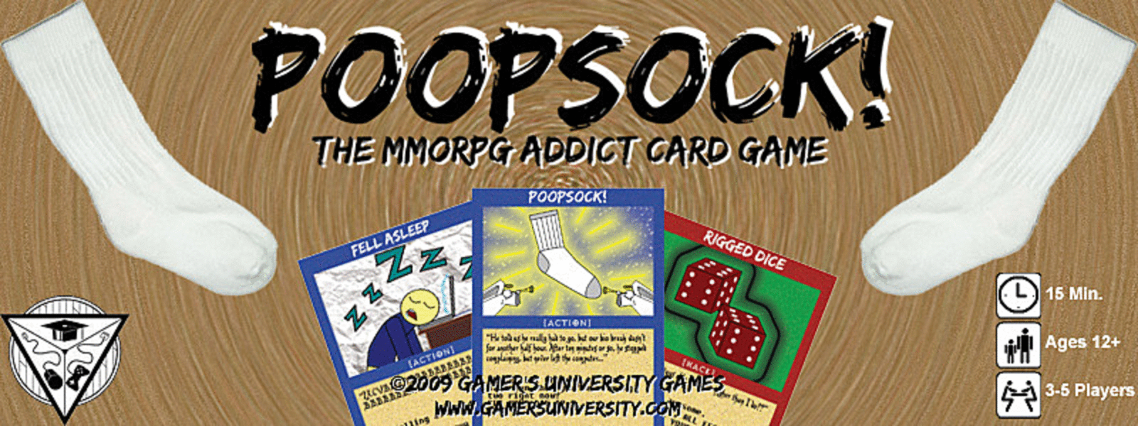 -In a nutshell- Not for the easily-offended, Poopsock! Is a simple satirical card game in which a group of MMORPG addicts are playing their newest game of choice tirelessly to be the first to Maximum Level. Every round represents a night in which the players play the game and otherwise hassle each other to gain the most Levels. Whoever gets to the predetermined goal Level (typically between 50-70 to start) is the winner and may gloat until physically assaulted.