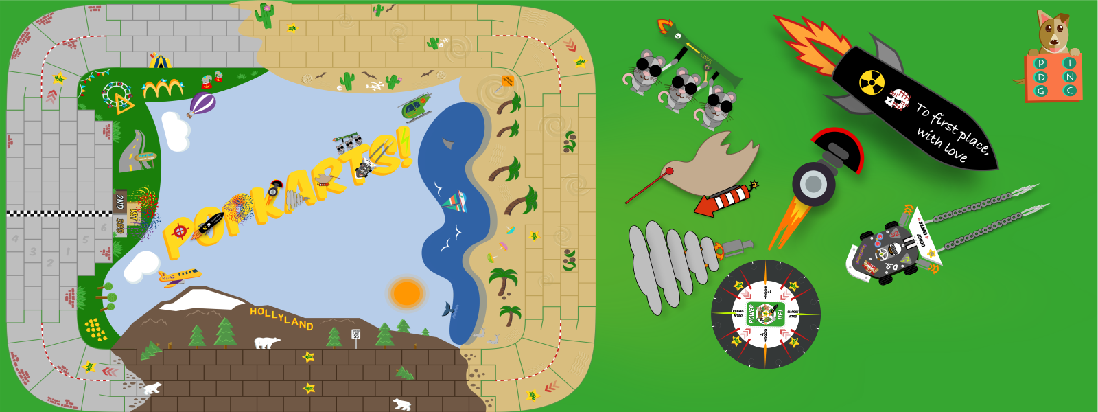 Popkarts is a fast-paced racing game that blends the nostalgia of classic videogame kart racers into an action packed board game that plays in 30-60 minutes. In Popkarts, 1-6 players take turns moving their pit crew clockwise on a speedometer to generate move points. Move point are then spent to move their Popkart forward on the game board in a sprint through Hollyland for first place!