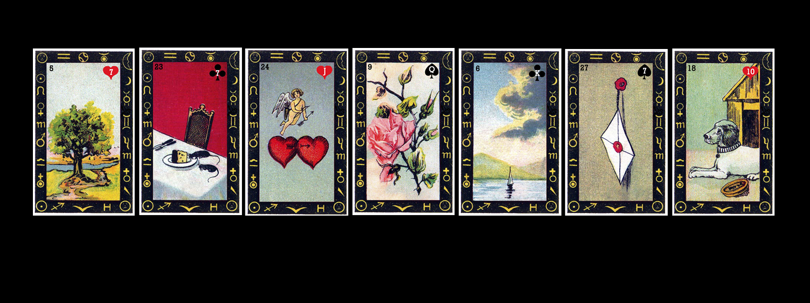 Some cards are different than traditional Lenormand, with many bird cards, while lacking the Snake, Whip, Child, Fox, Bear, Park, and Lily. A Raven, Spade, Cat, Rooster, Gold, fancy Dinner Party table setting, and Swans are included instead. Experienced readers may find the different cards have been selected to conform to traditional meaning as closely as possible in Popov Lenormand.