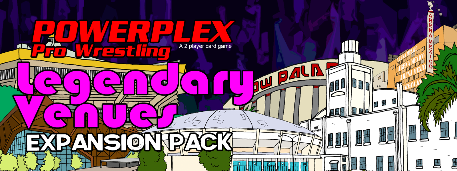 From Japan to Mexico and all over the United States, this 9 card expansion allows you to add more depth and context to your Professional Wrestling matches. Each of these venues adds a special "house rule" to your match based on the history of that building. Weather you choose a venue at random, or book your show with a specific setting in mind, Legendary Venues will add a layer of history to your matches!