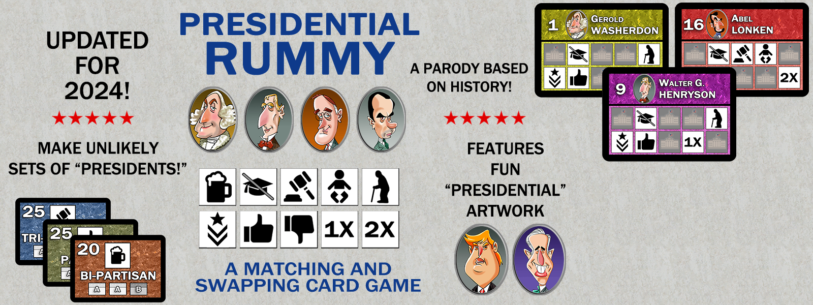Keeping this in mind, I came up with a card game with a simple melding mechanic that uses political parties and Presidential attributes as "suits" and values. Like Rummy, there are wild cards, and you can swap cards to reach your goals. Since this is a parody game, all "Presidents" are fictional, but they are based on their historical counterparts.