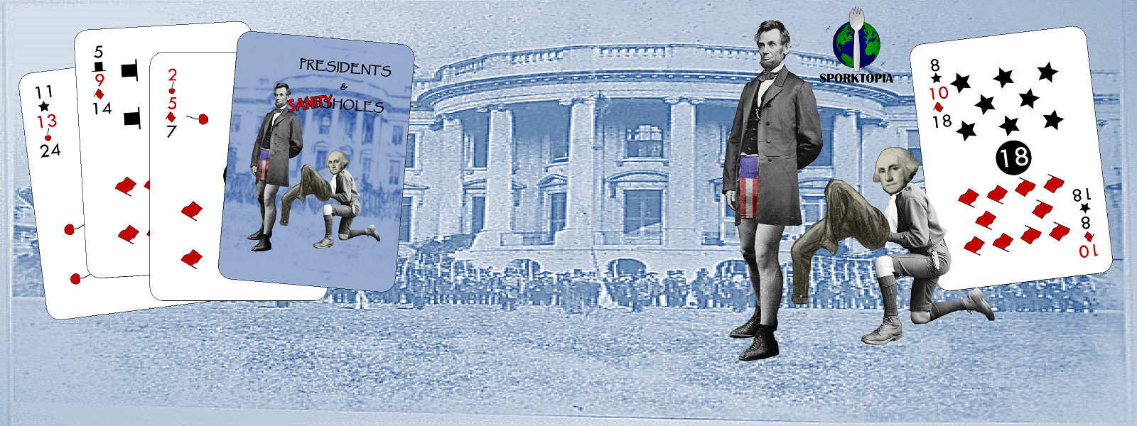 Presidents & Sanityholes uses the double card concept from Sanity (Sanity [www.thegamecrafter.com]), which allows cards to be played three different ways, but introduces four new suits (cherries, flags, hats and stars), a Missionary Style deck of cards and rules for three card games. These include: Presidents & Sanityholes, Bull Sanity and Sanity Rook.