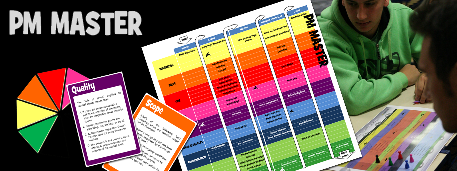 Project Management Master é um jogo de tabuleiro com perguntas sobre gerência de projetos em diferentes áreas do conhecimento, como tempo, escopo e gestão da qualidade. O jogador, que primeiro responde corretamente uma pergunta de cada uma das nove áreas de conhecimento, ganha o jogo.