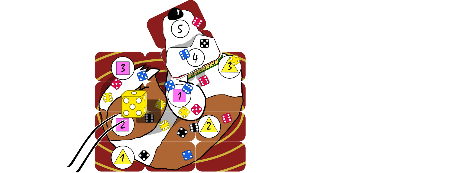 In this game mixing strategy, dexterity and a pinch of luck, you'll be jumping your dice into an open mint tin and a central board to participate in an area majority contest. Let the best troupe win!