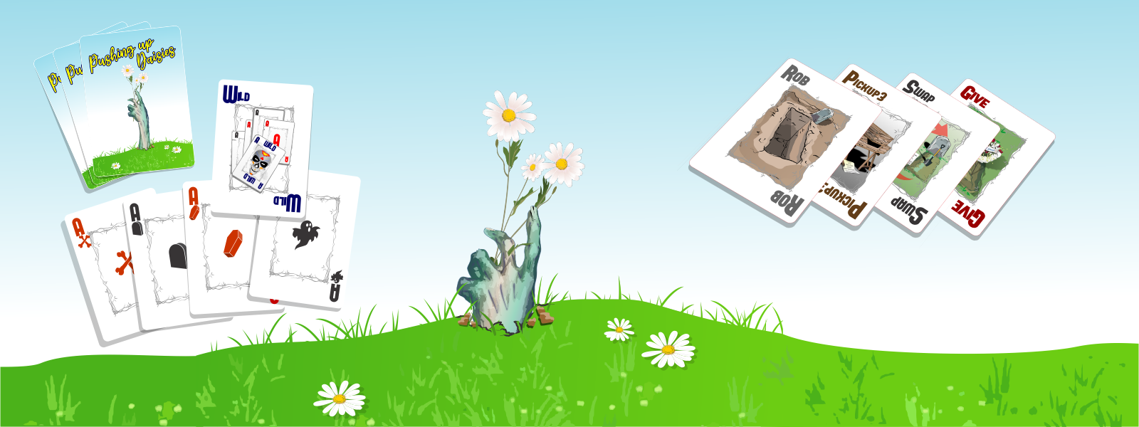 The custom basic 52 card deck isn't your normal deck. It has it's own ghoulish suits: Bones, Stones, Caskets and Ghosts. And there are 20 additional special action cards that add a whole new twist to the game of rummy. You can steal cards from other players, give cards away, force a player to pick up additional cards, or swap entire hands with another player! There's even wild cards that can increase your score each hand.