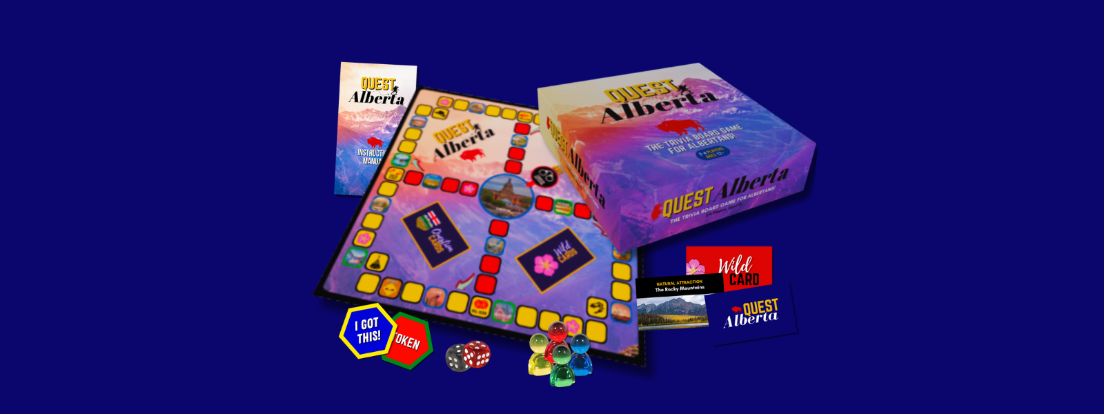 If you're from the gorgeous and grand western Canadian province of Alberta, and you think you know more about your home province than the average Albertan, then Quest Alberta just might be your cup of tea! Trek across the province and collect all five of the National Park Tokens (Banff, Elk Island, Jasper, Waterton Lakes, and Wood Buffalo) by navigating "Wild Cards" and more than 200 multiple choice trivia questions. The Quest Alberta trivia boardgame comes with: 1 game board (18"x18"), 210 trivia question cards, 42 "Wild Cards," 20 National Park Tokens, 4 "I Got This" Tokens, 4 player avatars (markers), 2 dice, and 1 instructions guide. I am also working on a companion trivia book that will offer hundreds of additional questions!