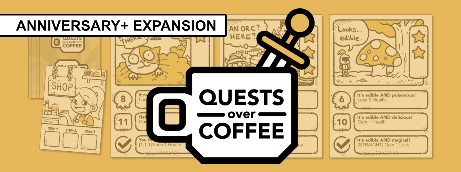 Can you believe it? Quests Over Coffee came out one year ago! I released it as a little thing for my birthday and it has found such a wonderful player base that it has exceeded all expectations. To celebrate the one-year anniversary, I decided to release an expansion of 9 new cards! Thank you so much for playing.