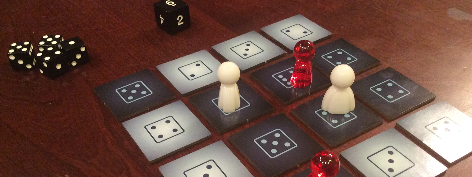 Quorsum is a strategic racing game for two players. The goal is simple enough: move your two pawns to the opposite corners of the 4x4 grid before your opponent does the same. "The grid" is more than a grid, though -- it is more like a third player, randomized in each new game, with its own fast and slow areas which sometimes help one side, sometimes the other; meanwhile, the two opponents jockey for the fastest paths home by trying to flip key tiles to help themselves or block their opponent.