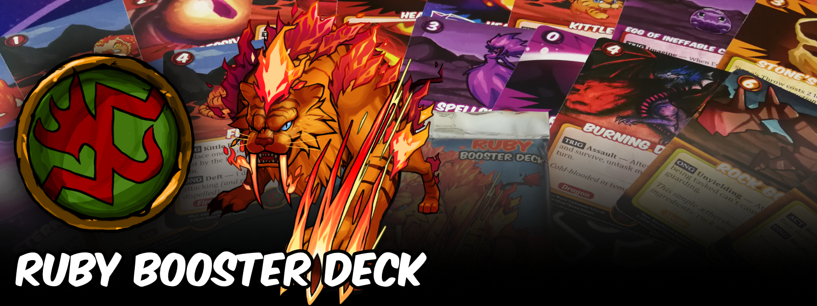 The Rüniverse: Ruby Booster Deck includes 18 randomized cards in a mix of the Ruby (red), Trine (orange), and Thyst (purple) facets. There are 9 commons, 6 uncommons, and 3 rares, with a chance for Star Variant versions of cards. Shuffle the contents of this Booster Deck with the 12 Ruby mages in the Ruby vs. Emry 2-Player Starter Set to form a starter deck. Ruby is the red facet, the faction of elemental fire and aggression. Ruby’s featured traits in the Base set are Fire, Lizard, and Rage.
