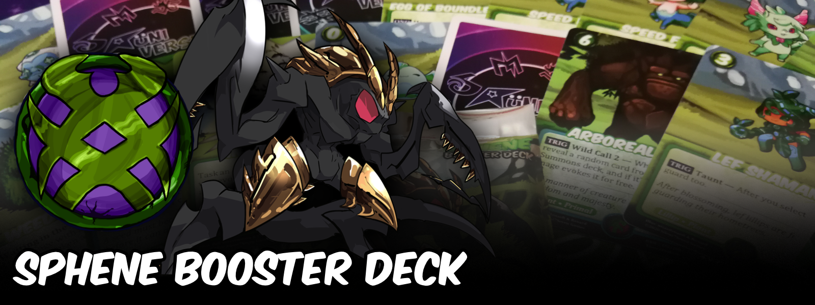 The Rüniverse: Sphene Booster Deck includes 18 randomized cards in a mix of the Sphene (yellow-green), Emry (green), and Orth (yellow) facets. There are 9 commons, 6 uncommons, and 3 rares, with a chance for Star Variant versions of cards. Shuffle the contents of this Booster Deck with the 12 Sphene mages in the Sphene vs. Saff 2-Player Starter Set to form a starter deck. Sphene is the yellow-green facet, the faction of small creatures, wetland terrain, and working in unison. Sphene’s featured traits in the Base set are Bug, Unity, and Slime.