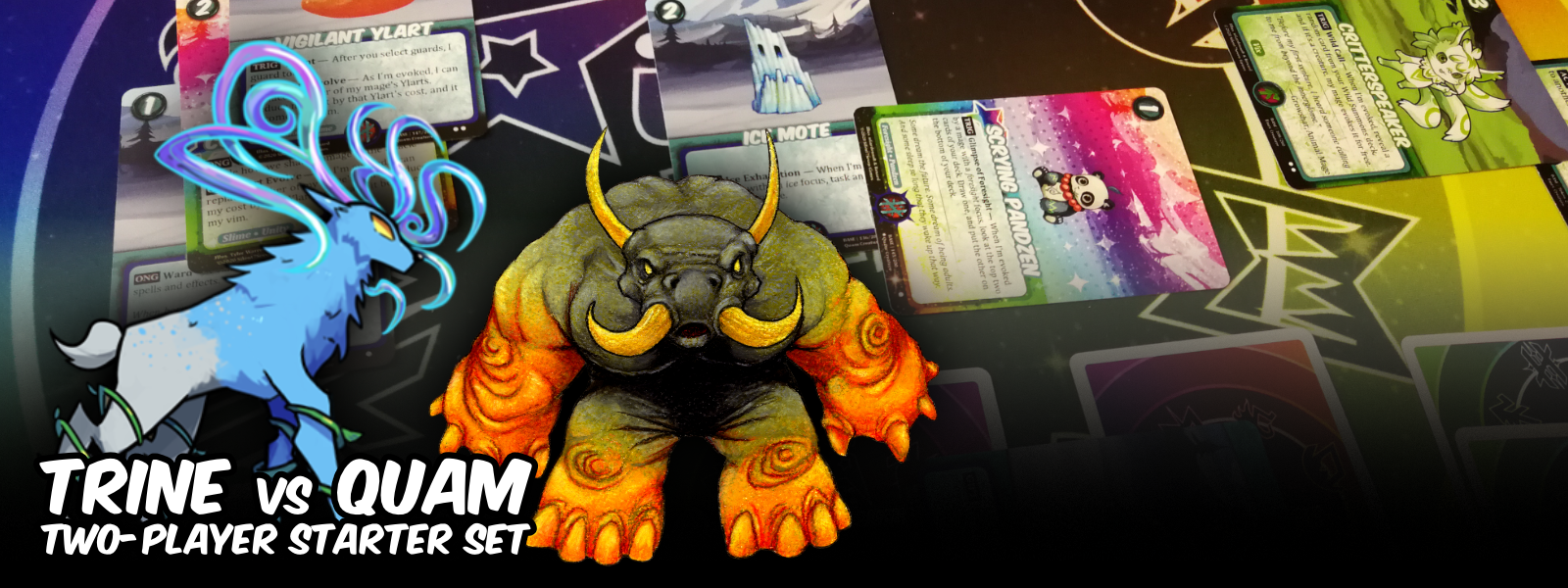 The Rüniverse: Trine vs. Quam 2-Player Starter Set includes 90 cards, a Quick-Start Rules sheet, a tuck box (featuring Trine on one side and Quam on the other), and all the counters and tokens two players need to play.