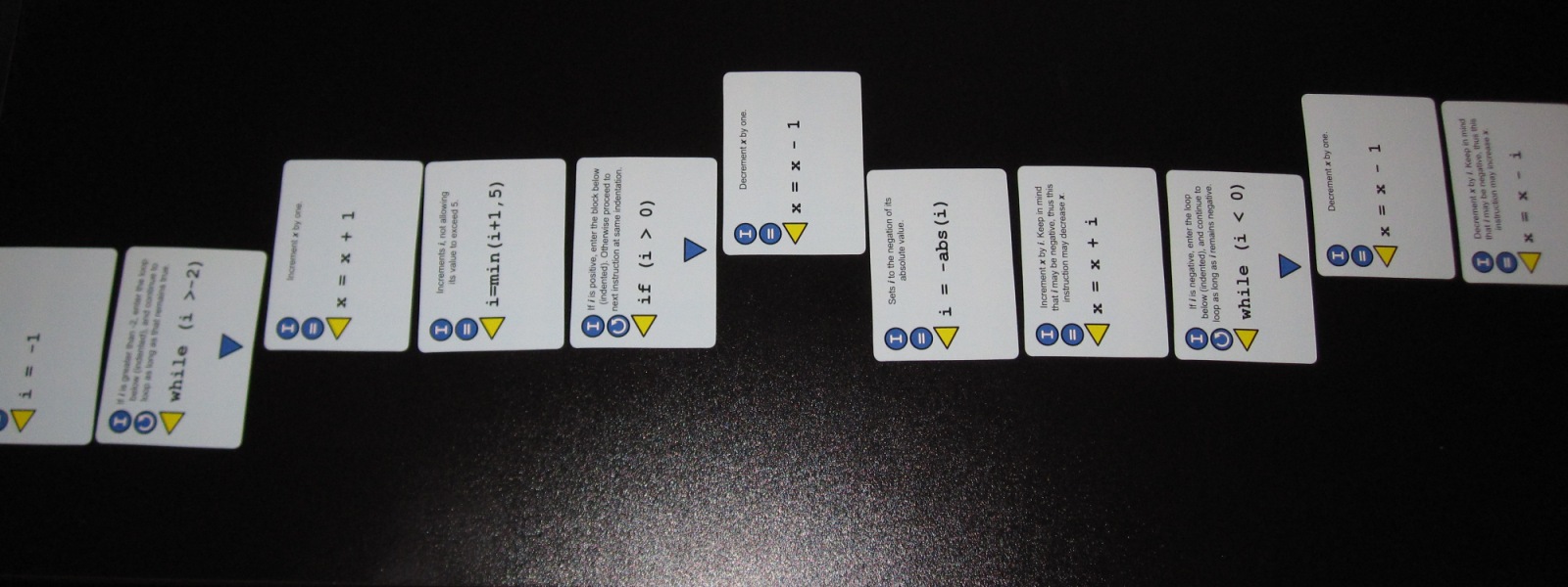 Game cards and counters are arranged on a table top to represent the order of and relationship between program instructions, the current instruction, and the values of variables. Competing players take turns modifying the computer program until one of them achieves his or her objective of setting a variable to a particular value. Players accomplish their goals by appending instructions to the program, and by performing special actions such as inserting, deleting, or moving instructions. As the players modify the program, it advances, modifying variables and potentially moving players closer to or further from their objectives. For the complete rules download the (game) instructions.