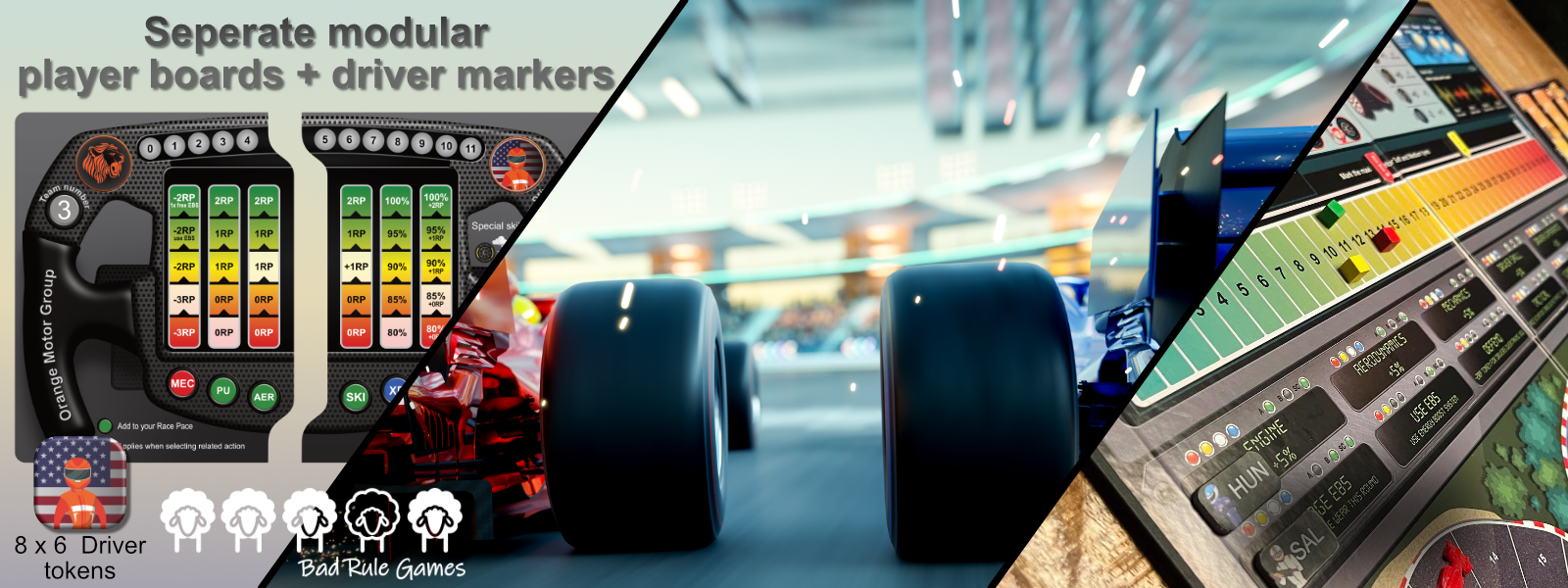 The new modular player board consists of 2 parts: a Team part (left) and a Driver part (right). Slid together, they form 1 steering wheel. - The Team part is the left part of your player board, showing the basic statistics of your team: Team number, Mechanics level, Power Unit level, Aerodynamic level. - The Driver part is the right part of your player board, showing the statistics of your driver: Driver number, Special Skill, Experience, EBS level. The driver name, number button and driver picture show the colour of your tokens.
