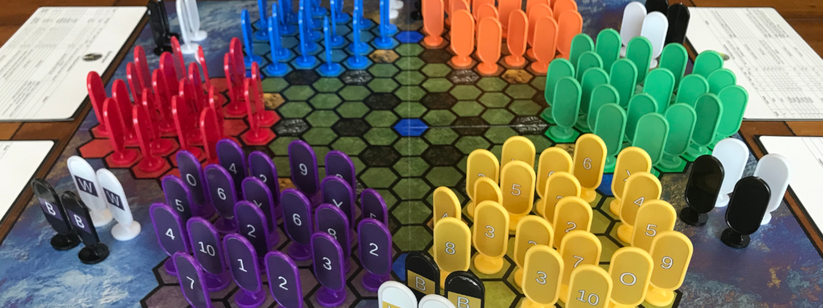This expansion adds 4 new factions, a 5 player board, a 6 player board, and pieces for 2 players.