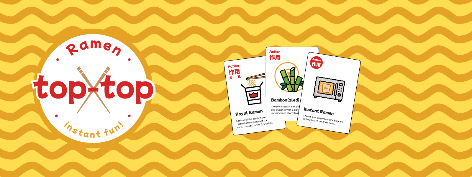 Ramen top-top is a turn based, deck building, memory game, where players compete to make the best bowl of ramen by collecting ingredients! Be the player with the least amount of points in your bowl to win, but watch out for tricky action cards!