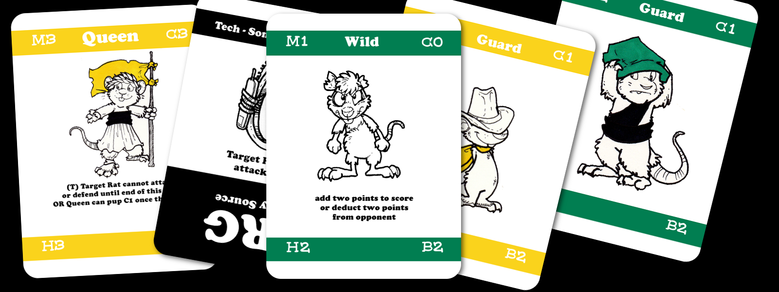 Rats! Clan Calamity is a card game for two players. Each player manages a rat clan that duels for dominance and survival. This deck has a Barn Rat Clan (gold) and a Wood Rat Clan (green).