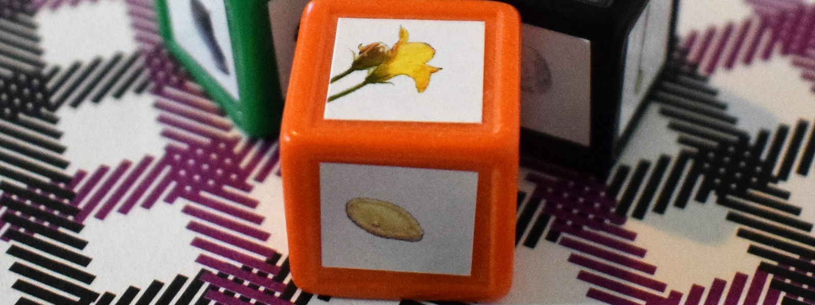 The way these were intended to assemble (as the stickers come on a sheet and you get to put them on the three indented dice) was with the six animal images, the witch's familiars, went to one die; the six pumpkin types on the second and the six symbols on the third. But you can arrange them however you like!