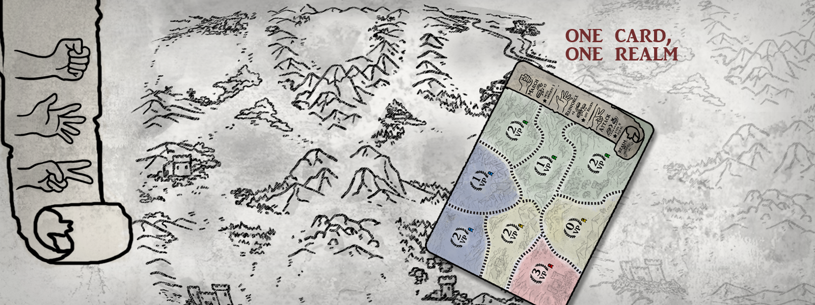 Realm of Ironfist is an area-control game that uses a Rock-Paper-Scissors sub-game to determine player’s action. Each hand matches an action that the player can perform in a turn. Since winning a hand also gives that player a powerful bonus, players not only need to think of how to best control the board, but what their opponent may play too. Predicting your opponent, and outsmarting them is the key to win this simple, yet deep one-card strategy game for two.