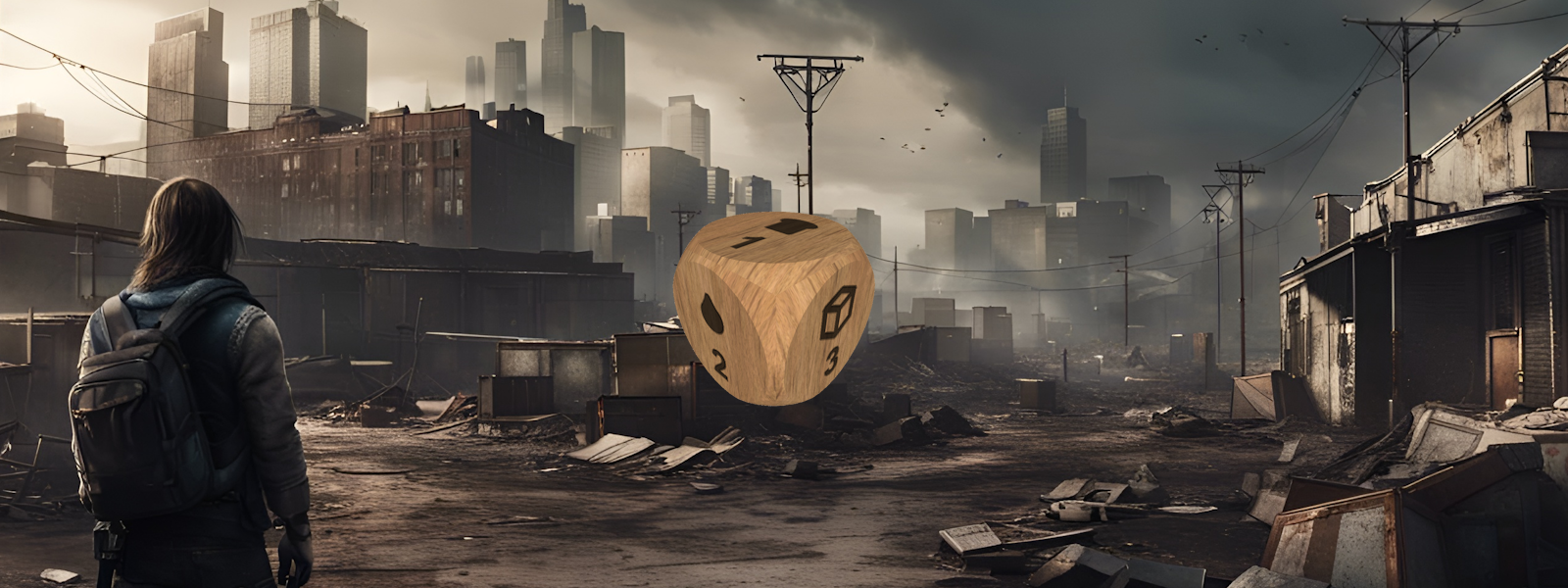 6 dice with 6 faces and a unique two-dimensional twist symbolize the unpredictable challenges of a desolate world. Each turn, players roll dice to ascertain: