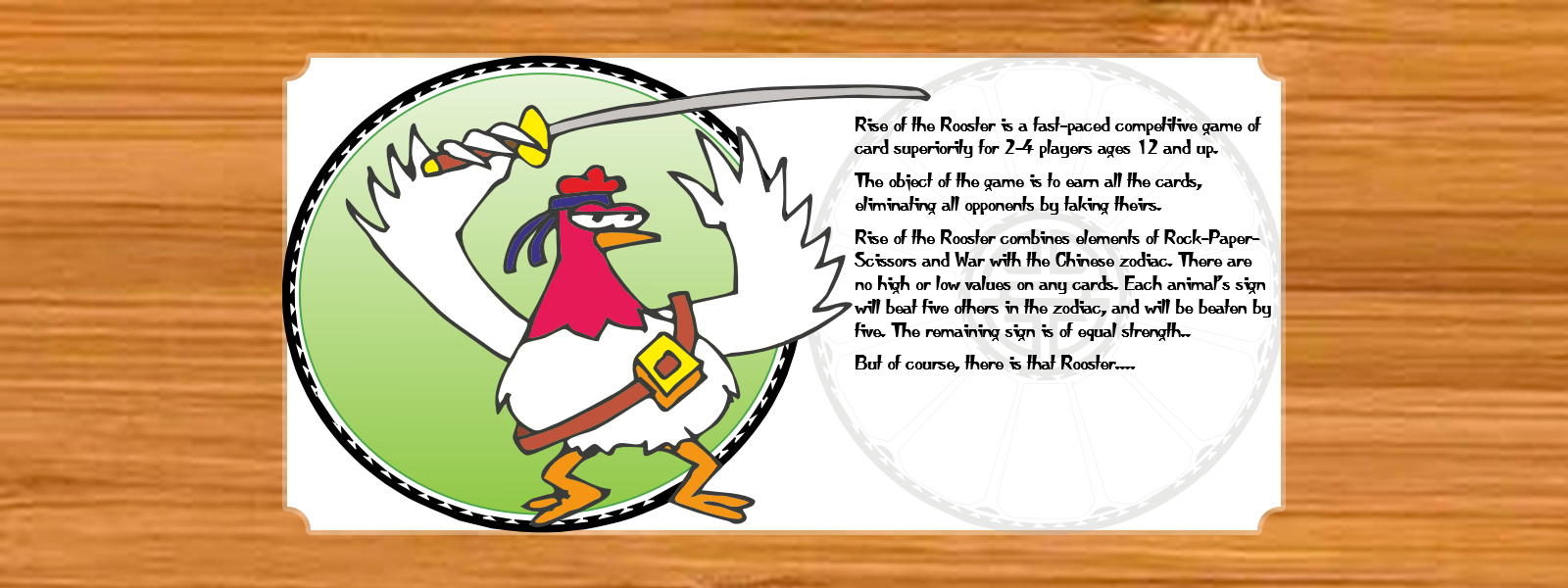Rise of the Rooster combines elements of Rock-Paper-Scissors and War with the Chinese zodiac. There are no high or low values on any cards. Each animal's sign will beat five others in the zodiac, and will be beaten by five. The remaining sign is of equal strength..