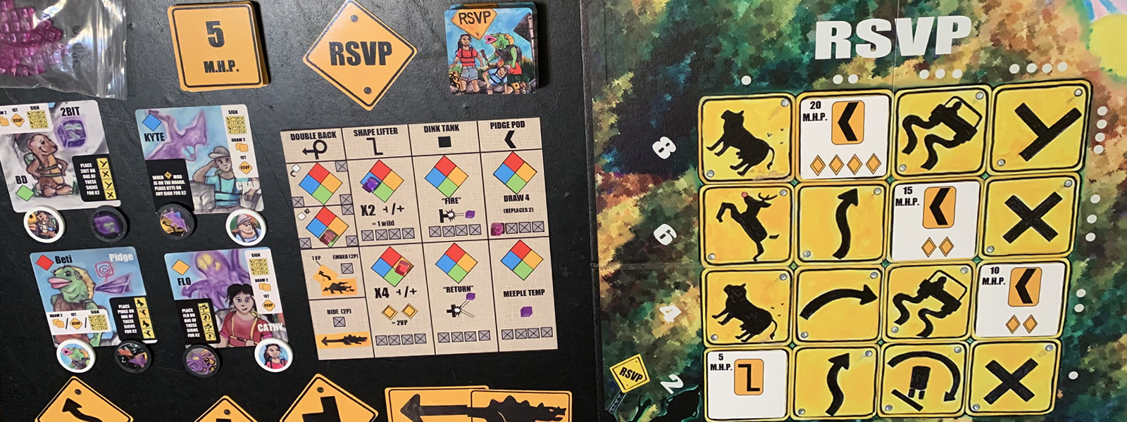 Four Errantyme hikers compete in a friendly retro competition known as RSVP. The goal is to gain the most victory points by hacking mods, with a bit of help from their Ensigns.