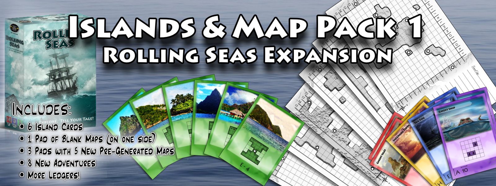 This expansion for Rolling Seas comes with a new way to set up the game! You'll start the game with the blank map. Everyone will draw four of the six islands on their map, so each player will have a slightly different layout and your map will be different every game!