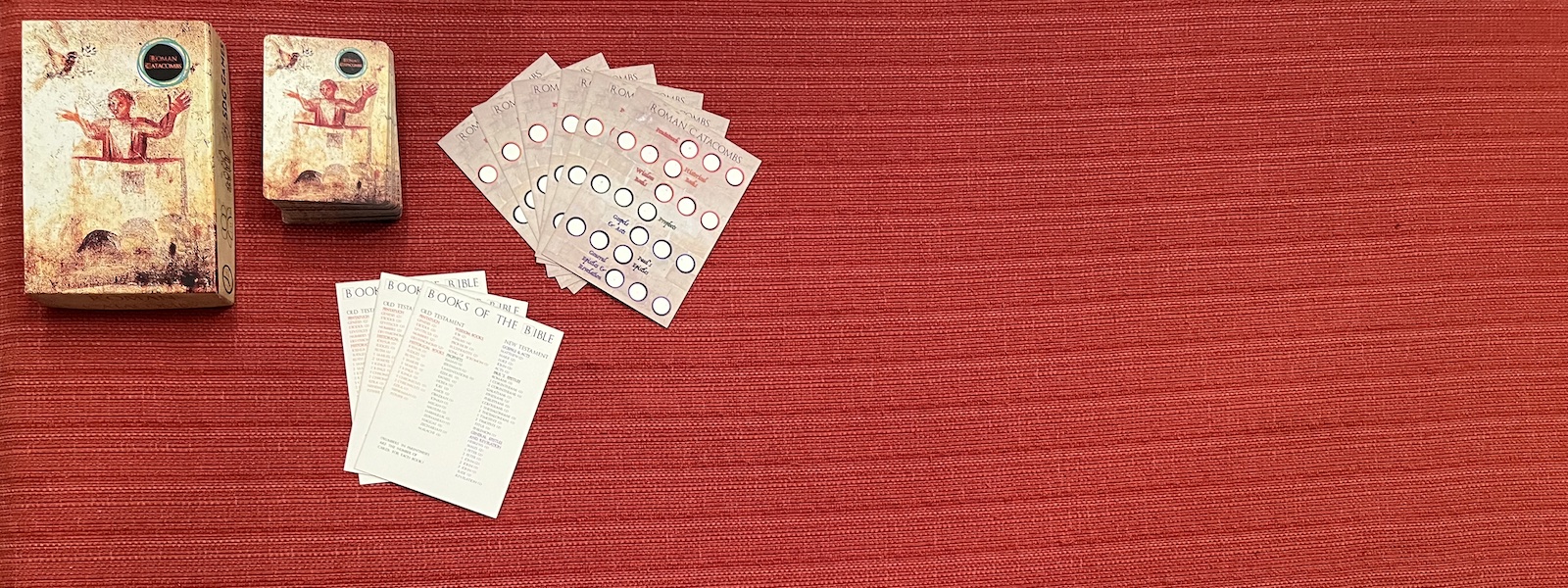 Each of the Bible book cards lists all of the books of the Bible organized into these categories and in canon order. After the name of each book is a number in parentheses. This indicates how many cards for that book are in the Roman Catacombs deck.