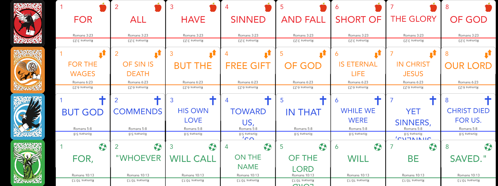 As the game is played, the gospel of Jesus Christ is presented using four verses from the Biblical book of Romans.