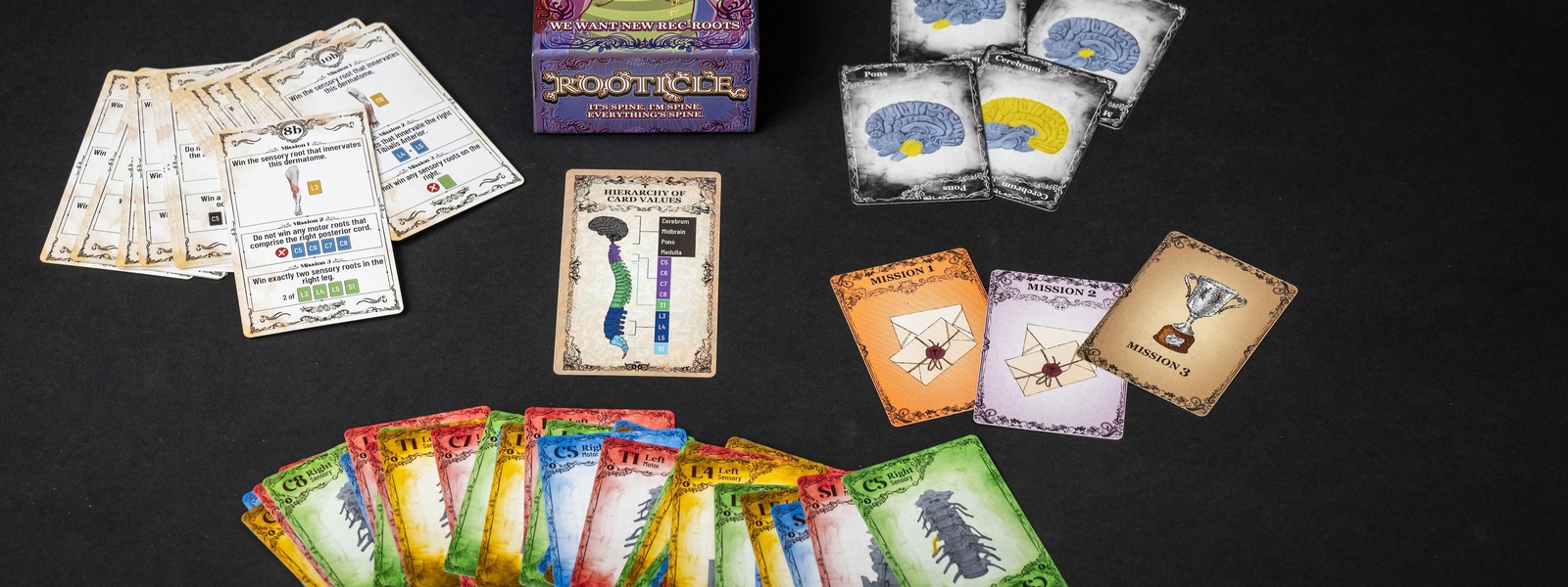 In Rooticle, players work as a team to complete three missions having to do with the spinal nerve roots that innervate the arms and legs. Each mission is assigned to a specific player, requiring that player to collect (or not collect) certain cards to fulfill the mission’s requirements.