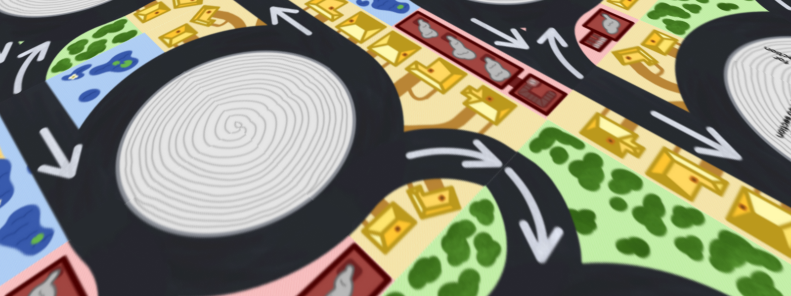 Roundabouts is a 2-4 player tile-laying card game. Players take turns drawing and placing square cards to create a grid of winding and charming roundabouts.
