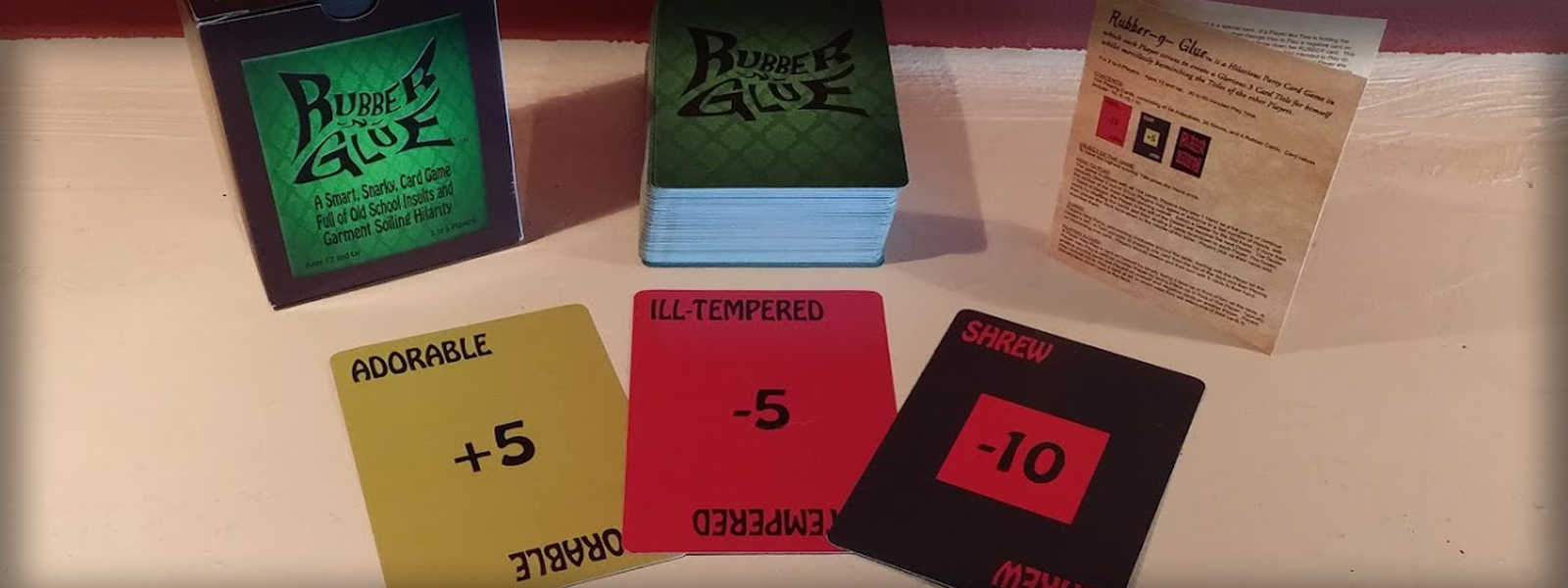 RUBBER-N-GLUE is a hilarious party card game in which each Player strives to create a glorious, 3-card, Title for him or herself whilst mercilessly besmirching the Titles of the other Players.