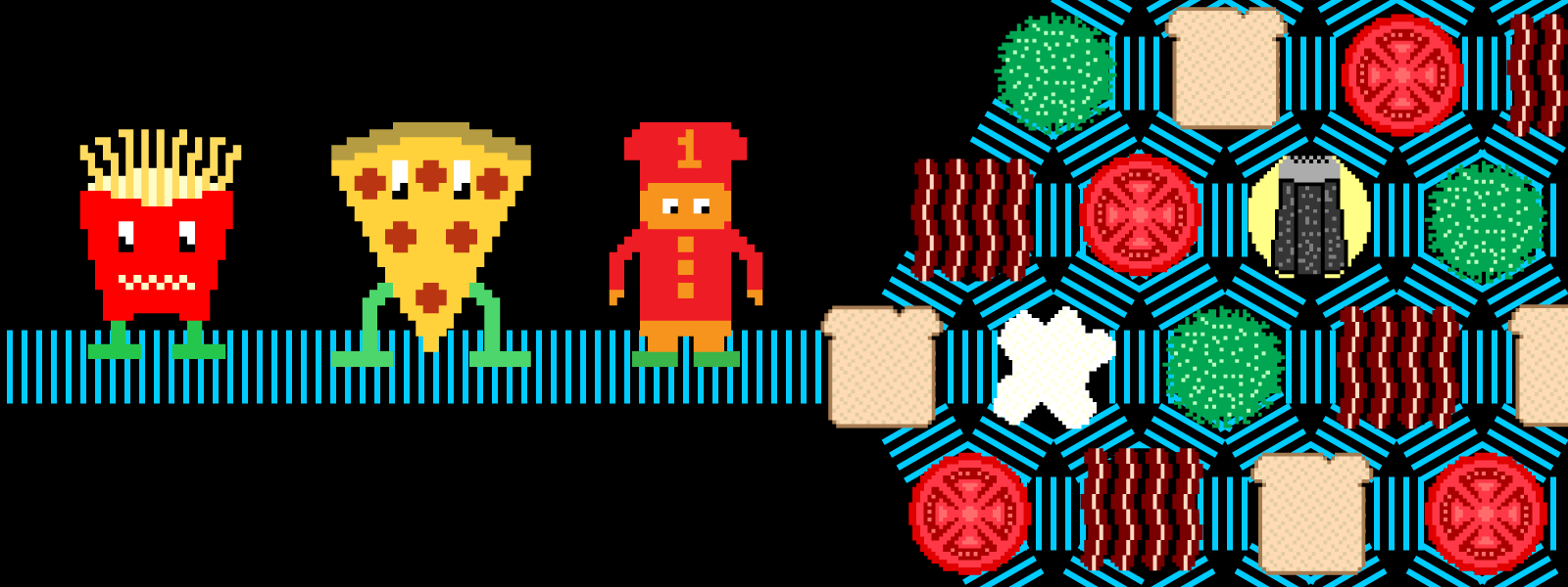 In this re-interpretation of the Arcade Classic “Burger Time” take on the role of a chef and make sandwiches by moving around a board of hex tiles and picking up ingredients. Place those ingredients in common sandwich stacks in a press your luck situation to be the one that makes the completed sandwich. All the while avoid the Junk Food Enemies that block your path.