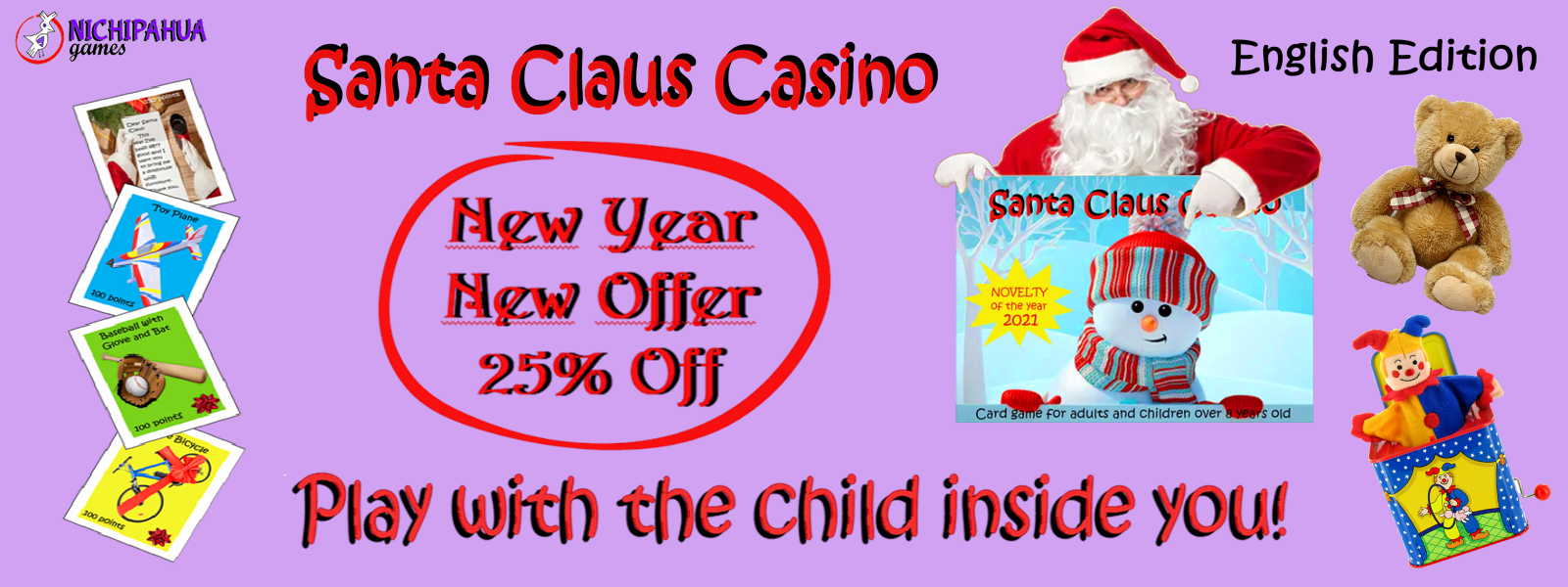 CELEBRATE CHRISTMAS ALL YEAR ROUND WITH “SANTA CLAUS CASINO” Greetings, if you are tired of being locked up at home due to the pandemic, I invite you to spend more time with your family, playing board games. Last year I invented and designed the newest and most fun card game for the whole family "Santa Claus Casino". It is dedicated to all people, children and adults, who love Christmas, and who dream all year round with the joy of holidays, decorations, dinners and gifts, but above all the moment of opening their gifts under the big tree, to receive many toys. Now with Santa Claus Casino we can celebrate Christmas 365 days a year. In this game the children have written their Letter to Santa Claus asking him for the toys they want as gifts for Christmas. You can become Santa's helper to collect those gifts in baskets. Each toy has a point value. Whoever collects the most gifts in baskets will get the most points and will be the winner. If you love Christmas and dream throughout the year of the joy of the decorations with their colored lights, the tree with lights and spheres, sweets and chocolates, the smell of cookies in the oven, the stories told in front of the fire of the fireplace, the family gathered for a big dinner, but above all it highlights the children's wish that the time comes to open the gifts to receive many toys, then “Santa Claus Casino” is for you. Play with the child in you. This item is only printed to order. For you to play in your own language, it is printed in six languages: ENGLISH, SPANISH, FRENCH, ITALIAN, PORTUGUESE AND GERMAN. LET ME EXPLAIN HOW IT WORKS: In this Game the children have already written their Letters to Santa Claus to ask him for the toys they want as a gift at Christmas. The players are in charge of gathering and placing on the table the Boys or Girls Cards with their request along with five identical toys that were requested. When the Card asks for a Color Toy, five cards of the same color but of different toys are gathered. The one who gathers more rows of toys, will form more "toy baskets", therefore will add more points and will be the winner. "Santa Claus Casino" is a card game for adults and children over 12 years old. children and adults. 2-6 players can participate. If you are interested, click on the following link: SANTA CLAUS CASINO ENGLISH EDITION