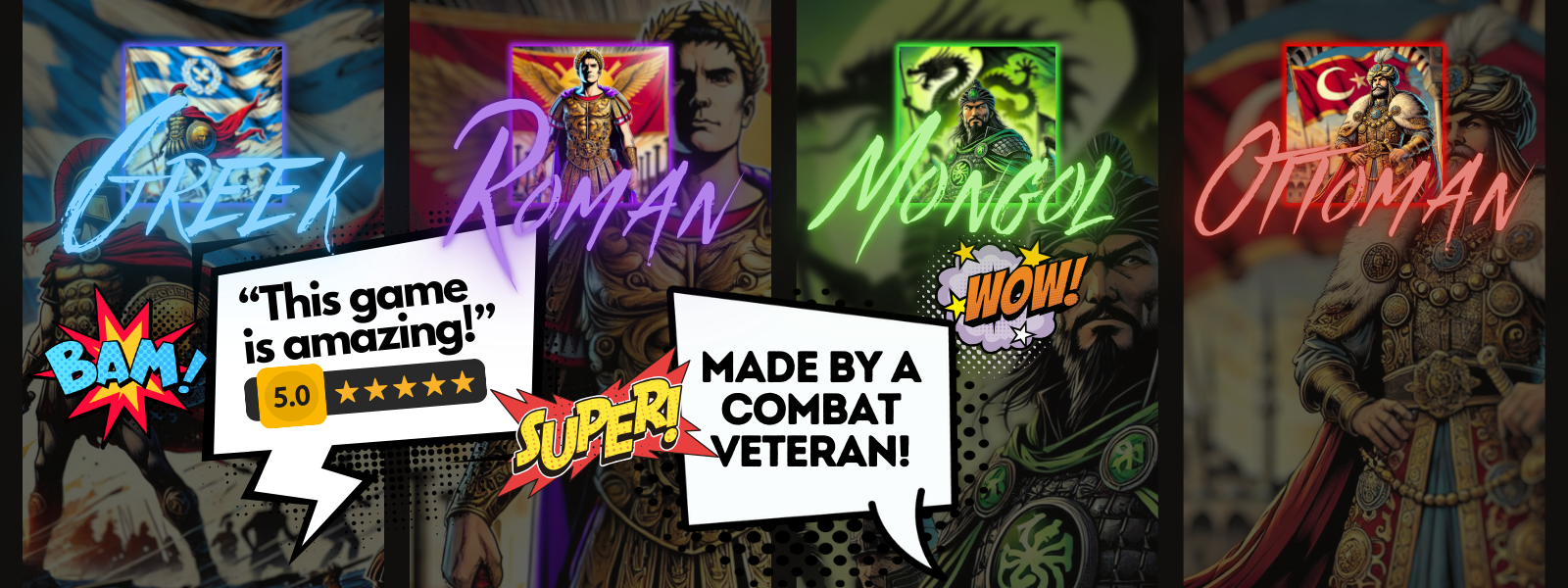 Introduction Enter the world of Savaş Battle Royale, a strategic card game inspired by the historical struggles of empires who fought for the land that bridges Europe and Asia we now call Türkiye. Savaş is the Turkish name for war. Command the armies of the Greek, Roman, Mongol, or Ottoman empires, each detailed with authentic historical facts displayed on each territory card. Roll the dice, maneuver your forces, and outthink your opponents as you battle for supremacy on a 5x5 battlefield. Every turn is a step back in time, where cunning tactics decide who will rise and who will fall. Experience the thrill of conquest and discovery—are you ready to make history?