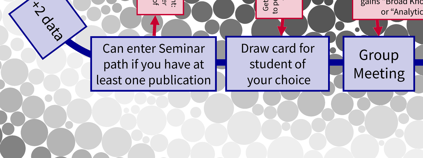 A key element of the game is that each student in your lab group has their own strengths (which you pick): analytical, broad knowledge, collaborative, creative, and hard-working. Publishing papers, adding a student to your group, and adding strengths to students accelerates the pace of research and the pace of the game. Will your hard-working student drink enough coffee to publish their paper before your opponent's creative student has a brainstorm blizzard? Will your analytical student discover a new technique that transforms their work from a medium profile paper into a high profile paper? Will the referees nit-pick your paper before it gets published?